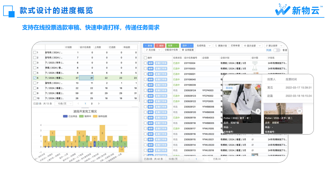 2)设计稿管理与在线审稿 设计图稿上传、素材留存在线投票、选款、审稿快速发起打样申请,减少沟通偏差