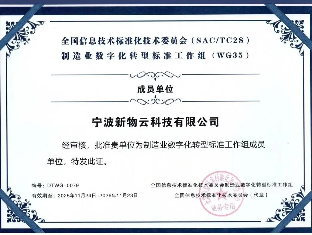 喜报!宁波新物云科技有限公司正式成为全国信息技术标准化技术委员会制造业数字化转型标准工作组成员单位!