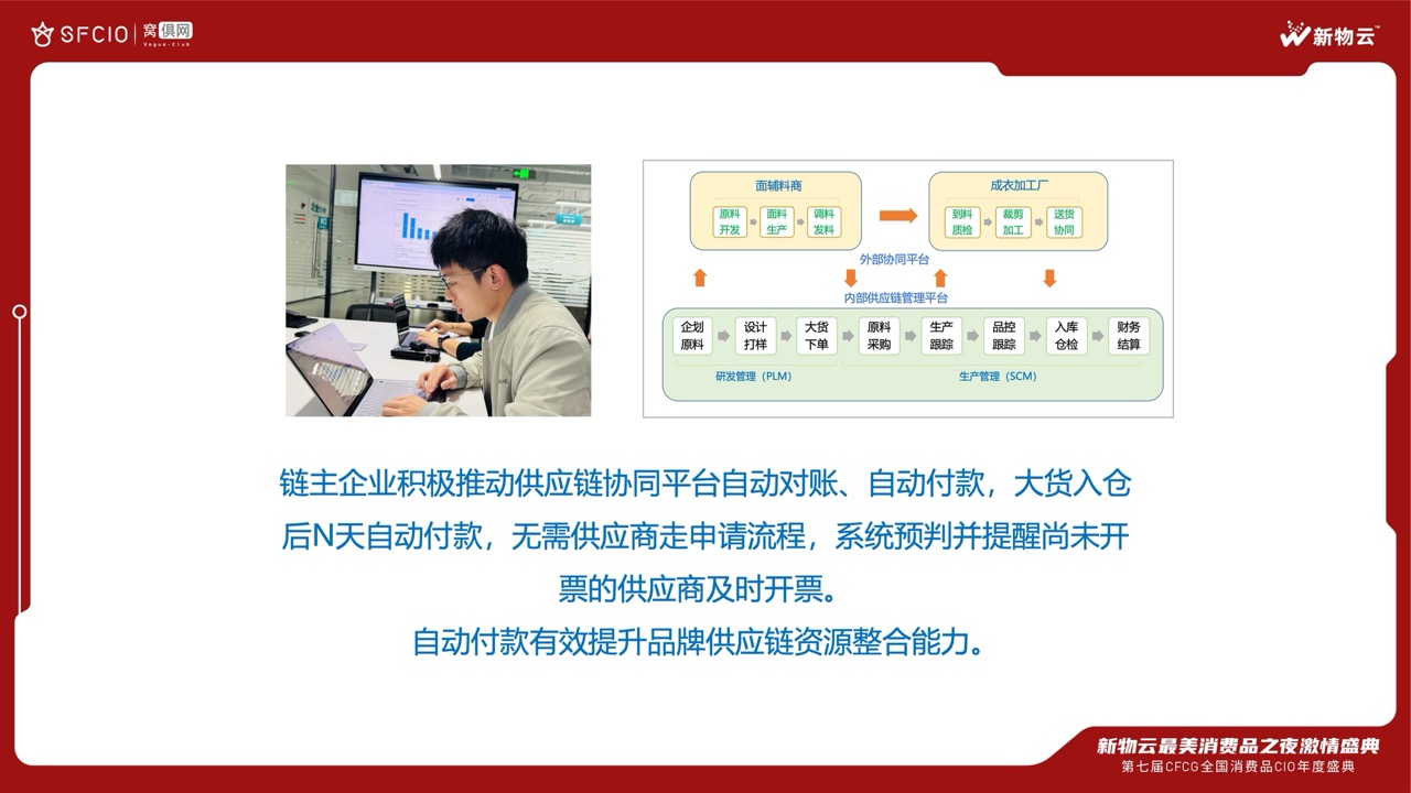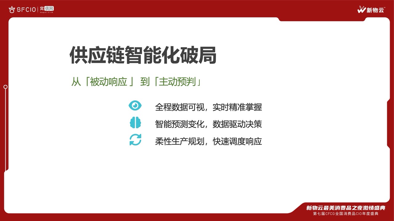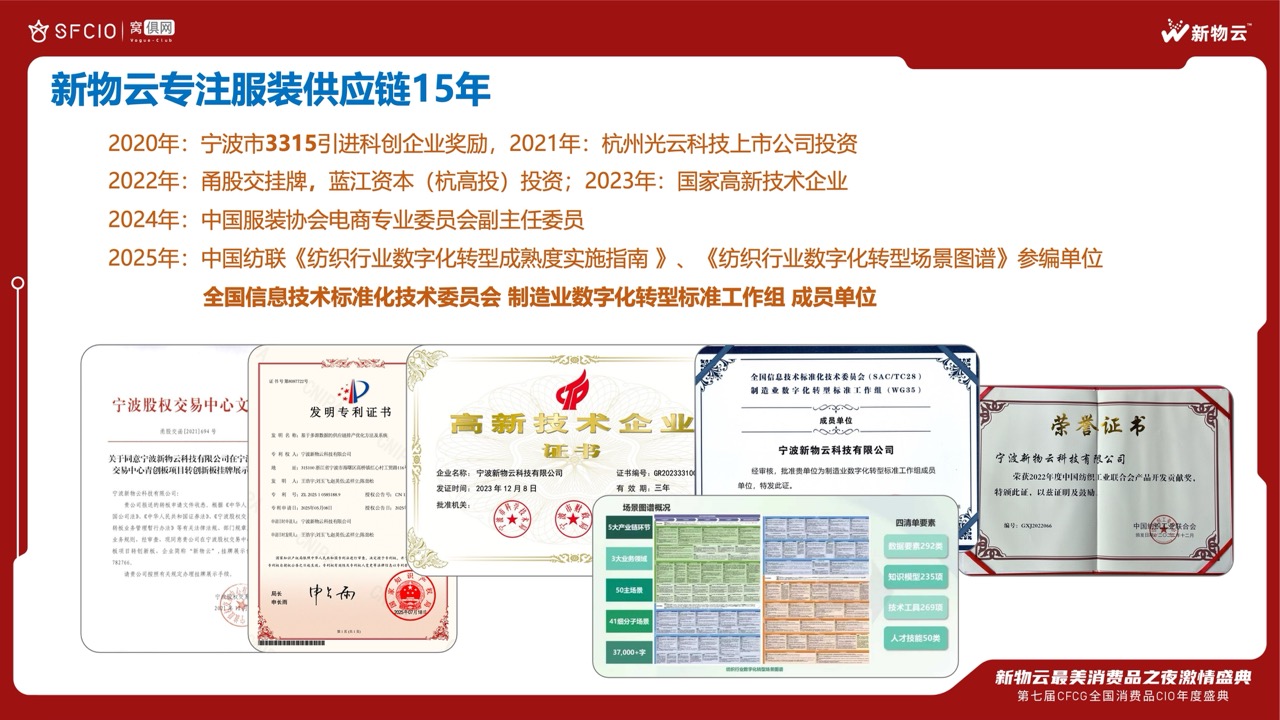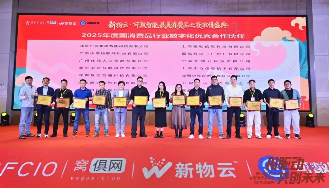 近日,第七届CFCG全国消费品行业CIO年度盛典在广东顺利闭幕,本届盛典以“AI驱动·智领未来”为核心议题,汇聚产业精英共探产业数智化转型路径。新物云凭借在纺织服装供应链领域的深厚积淀与数据智能落地成效,斩获“2025年度全国消费品行业数字化优秀合作伙伴”奖项,这份荣誉既是行业对我们深耕数智化领域的认可,也推动我们进一步沉淀技术与服务经验,为产业输出更具价值的供应链数智化解决方案。