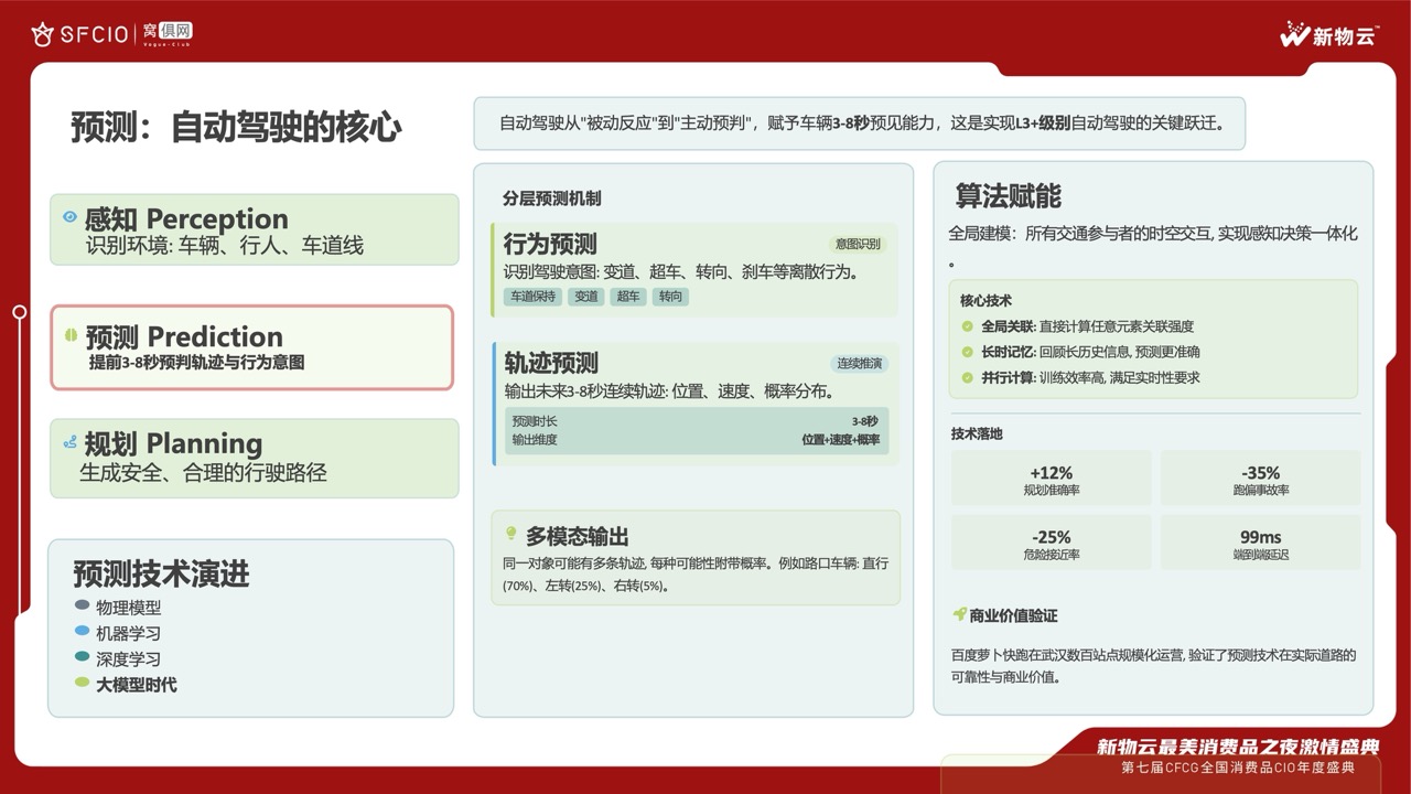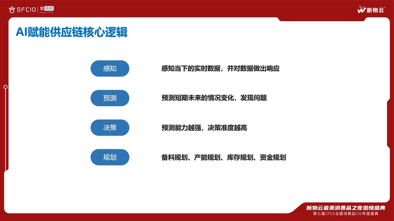 荣誉的背后,是新物云15年深耕纺织服装供应链的战略定力与技术深耕。不同于泛化的数字化工具输出,新物云立足行业“需求预判难、协同效率低、库存风险高”的核心痛点,创新性将自动驾驶领域“感知-预测-决策-规划”的核心逻辑迁移至供应链管理场景,构建起全链路数据智能协同体系。该体系以数据为核心生产要素,通过实时采集供应链各环节动态数据、基于算法模型精准预测市场需求波动、驱动生产与采购决策科学化、优化库存与履约规划,实现品牌从“被动应对市场变化”向“主动预判需求”的范式升级,打通需求端与供给端的精准联动链路。